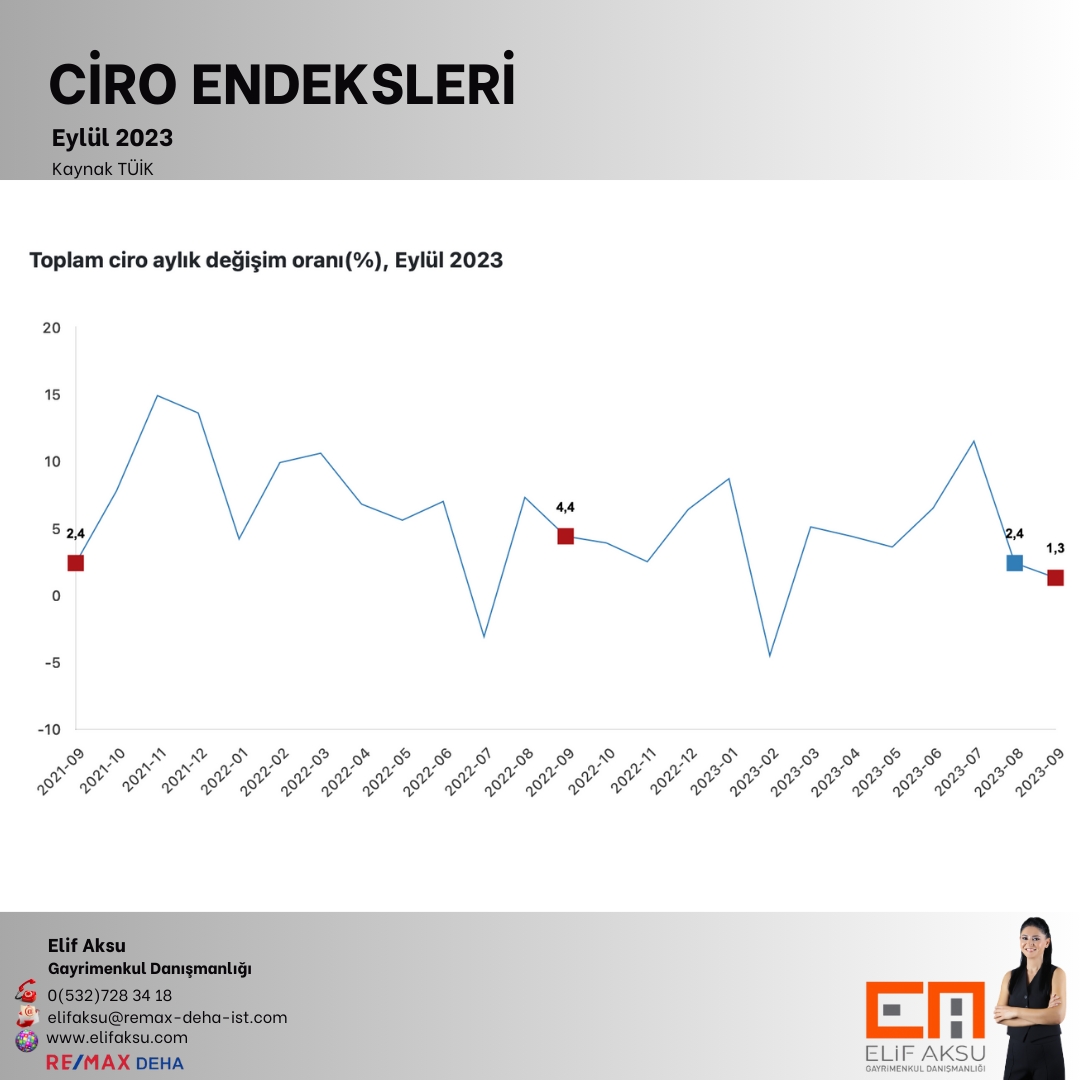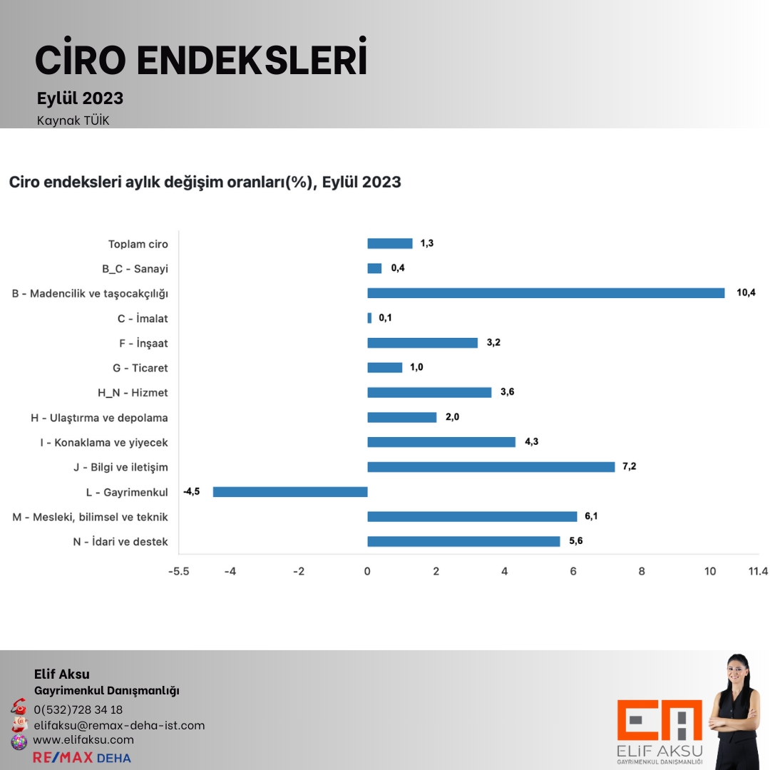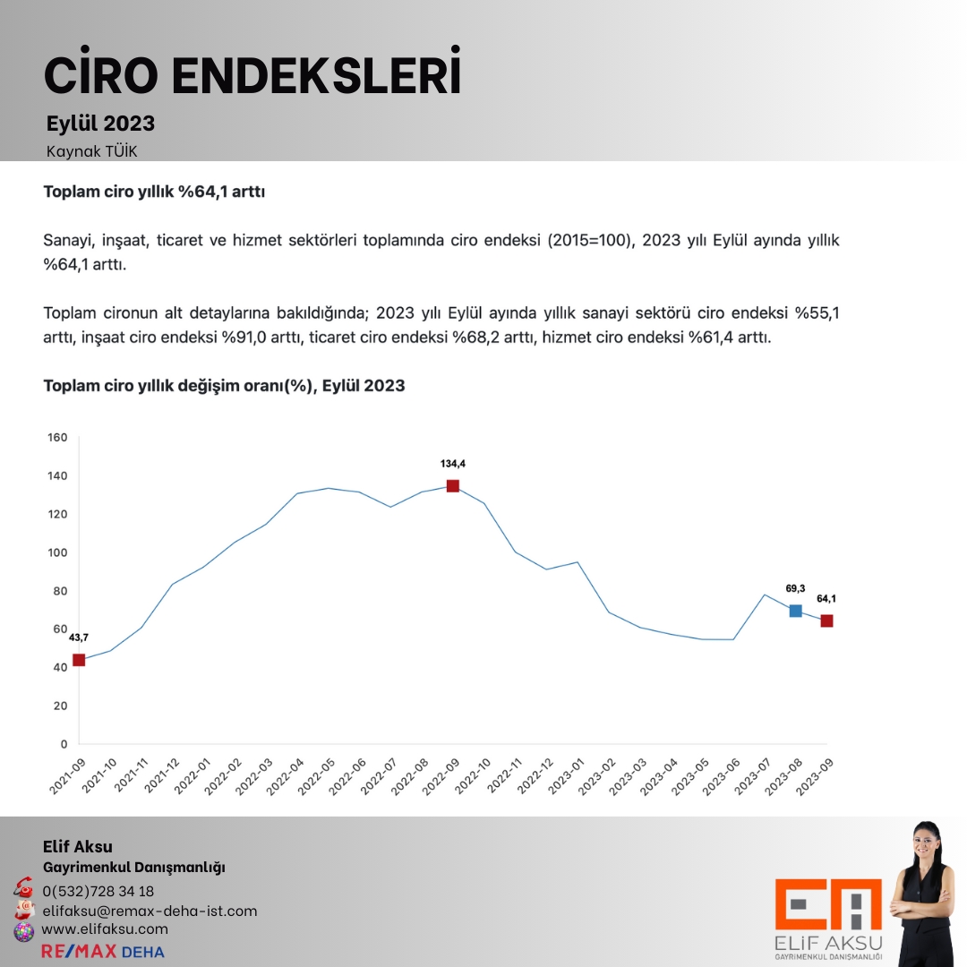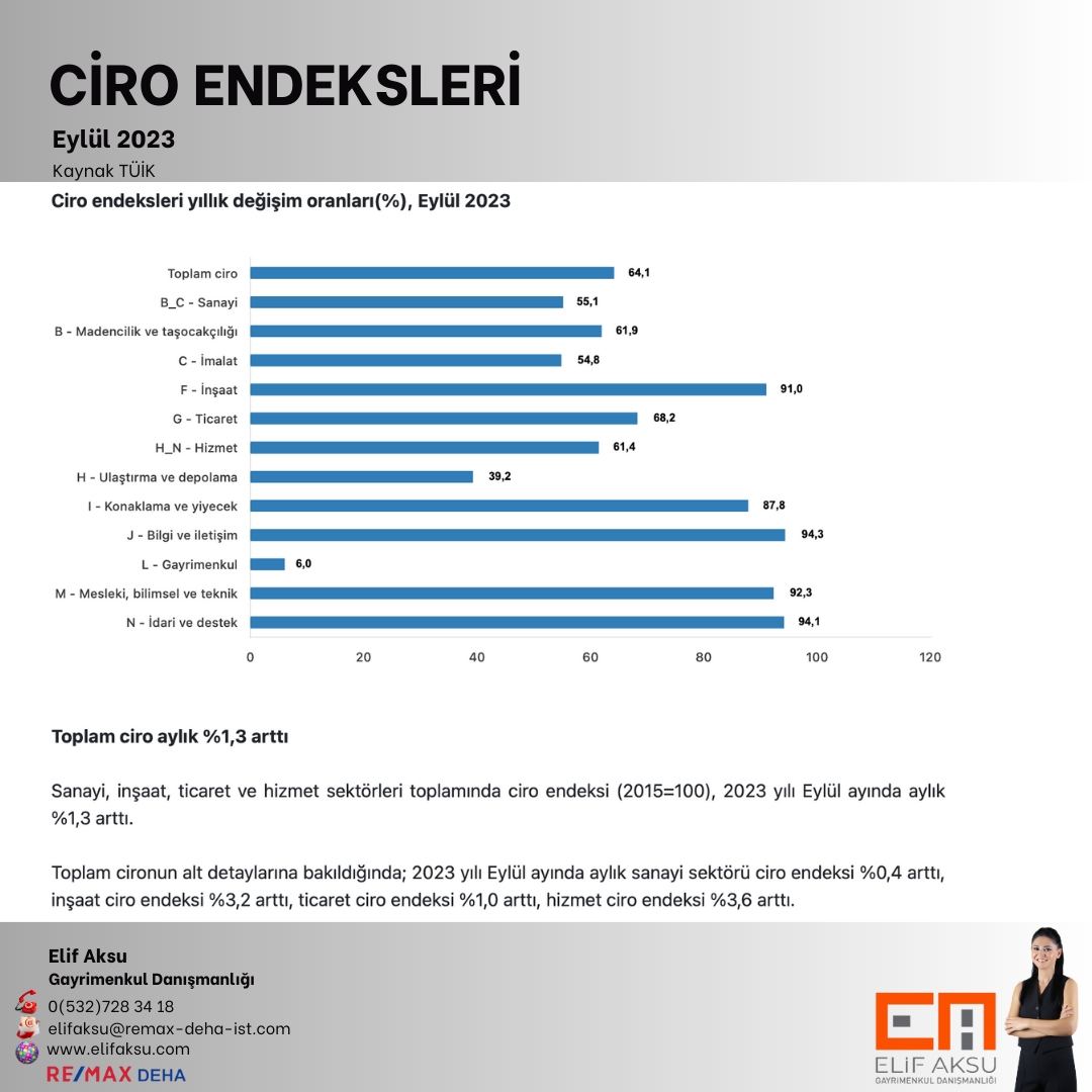 Toplam cironun alt detaylarına bakıldığında; 2023 yılı Eylül ayında yıllık sanayi sektörü ciro endeksi %55.1 arttı, inşaat ciro endeksi %91.0 arttı, ticaret ciro endeksi %68.2 arttı, hizmet ciro endeksi endeksi %61.4 arttı.