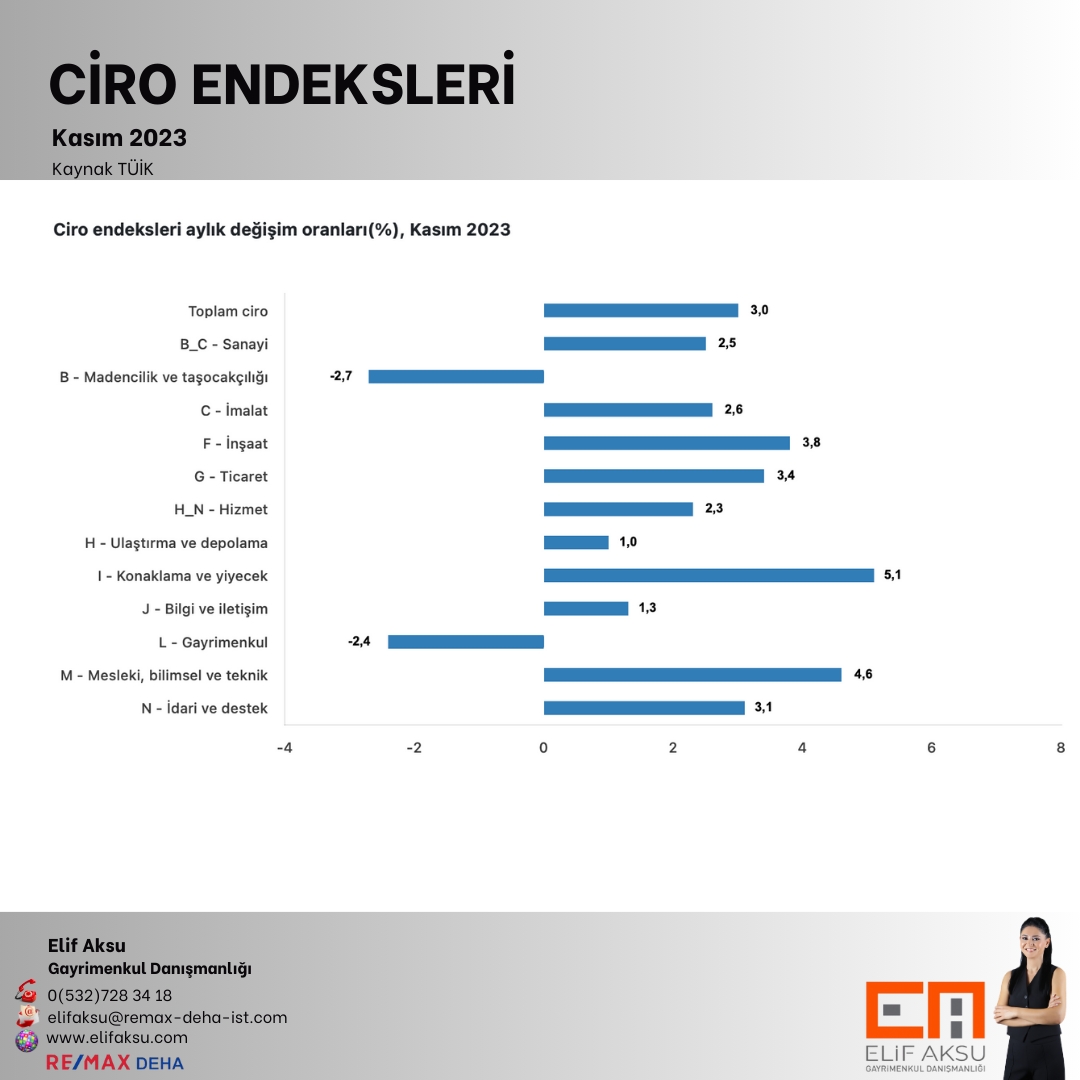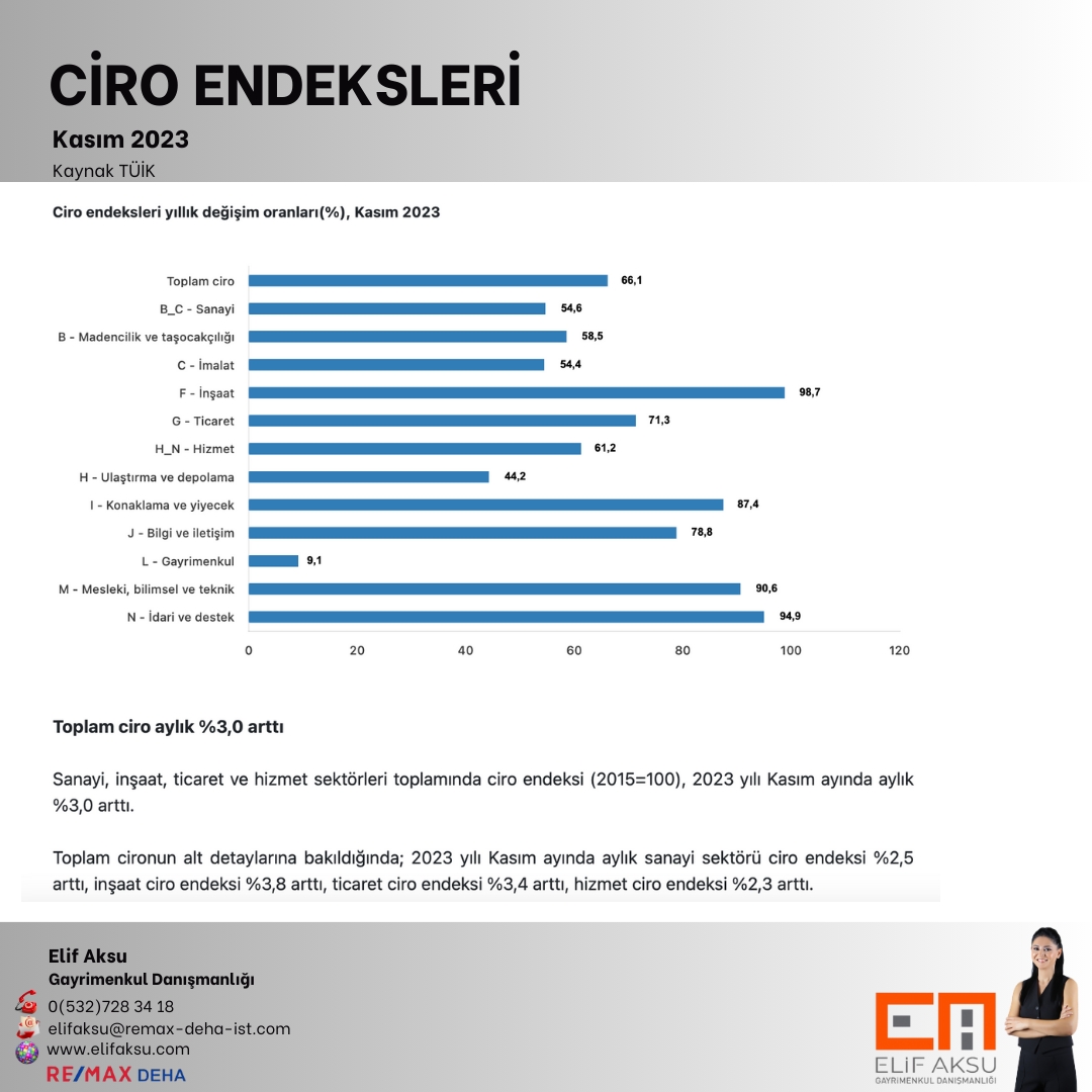 Toplam cironun alt detaylarına bakıldığında; 2023 yılı Kasım ayında yıllık sanayi sektörü ciro endeksi %54.6 arttı, inşaat ciro endeksi %98.7 arttı, ticaret ciro endeksi %71.3 arttı, hizmet ciro endeksi endeksi %61.2 arttı.