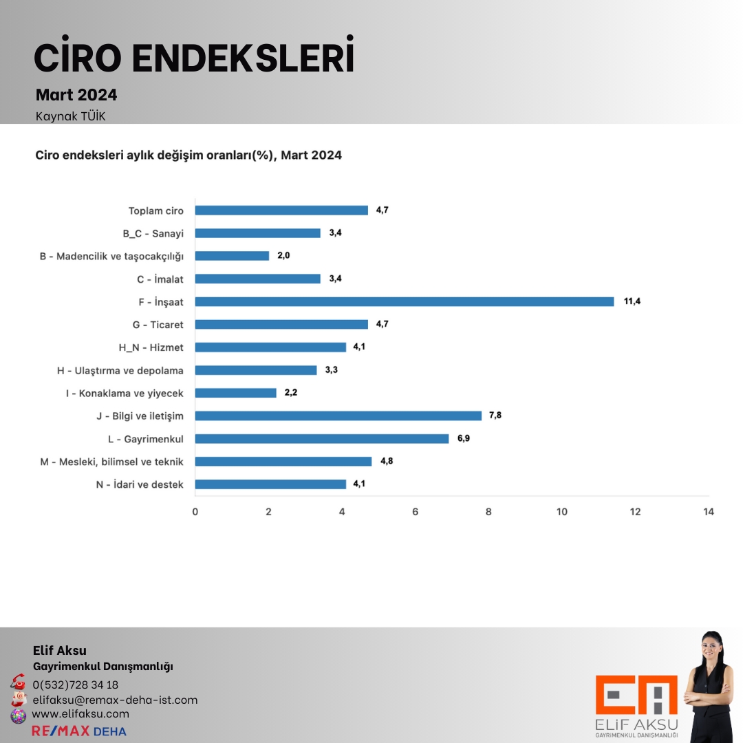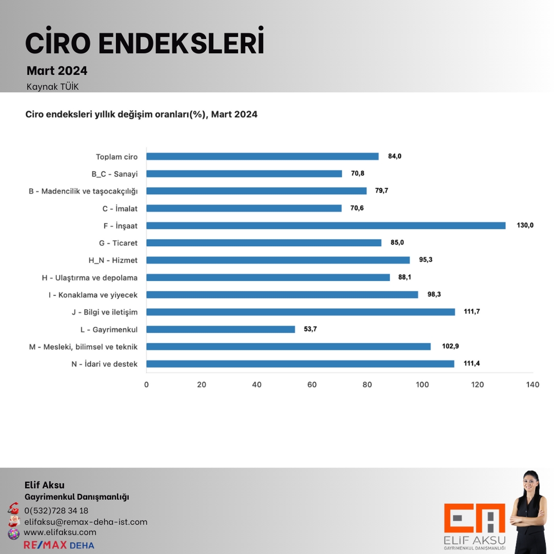 Sanayi, inşaat, ticaret ve hizmet sektörleri toplamında ciro endeksi (2021=100), 2024 yılı Mart ayında yıllık sanayi sektörü ciro endeksi %70,8 arttı, inşaat ciro endeksi %130,0 arttı, ticaret ciro endeksi %85,0 arttı, hizmet ciro endeksi %95,3 arttı.