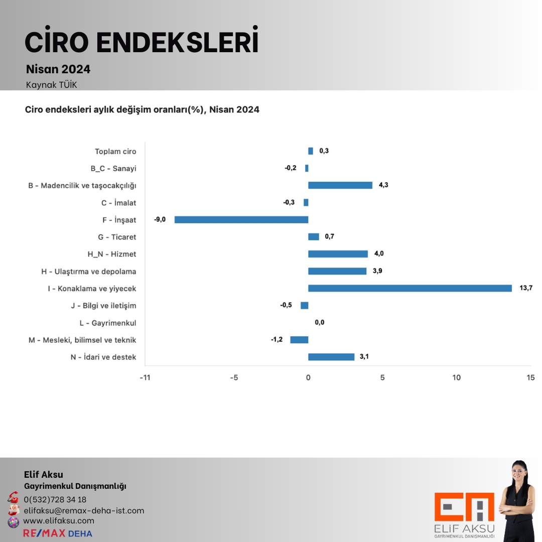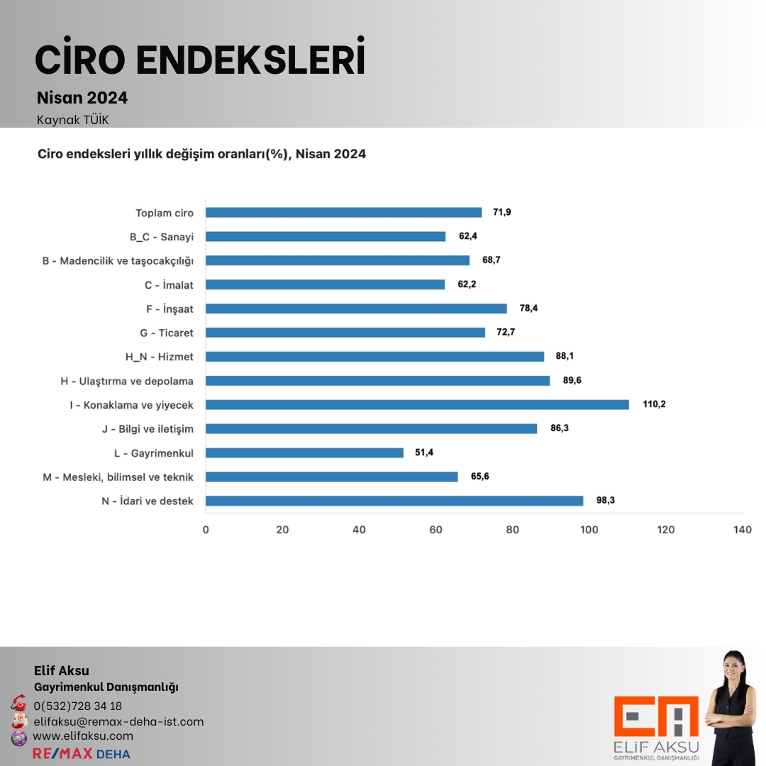 Toplam cironun alt detaylarına bakıldığında; 2024 yılı Nisan ayında yıllık sanayi sektörü ciro endeksi %62,4 arttı, inşaat ciro endeksi %78,4 arttı, ticaret ciro endeksi %72,7 arttı, hizmet ciro endeksi %88,1 arttı.