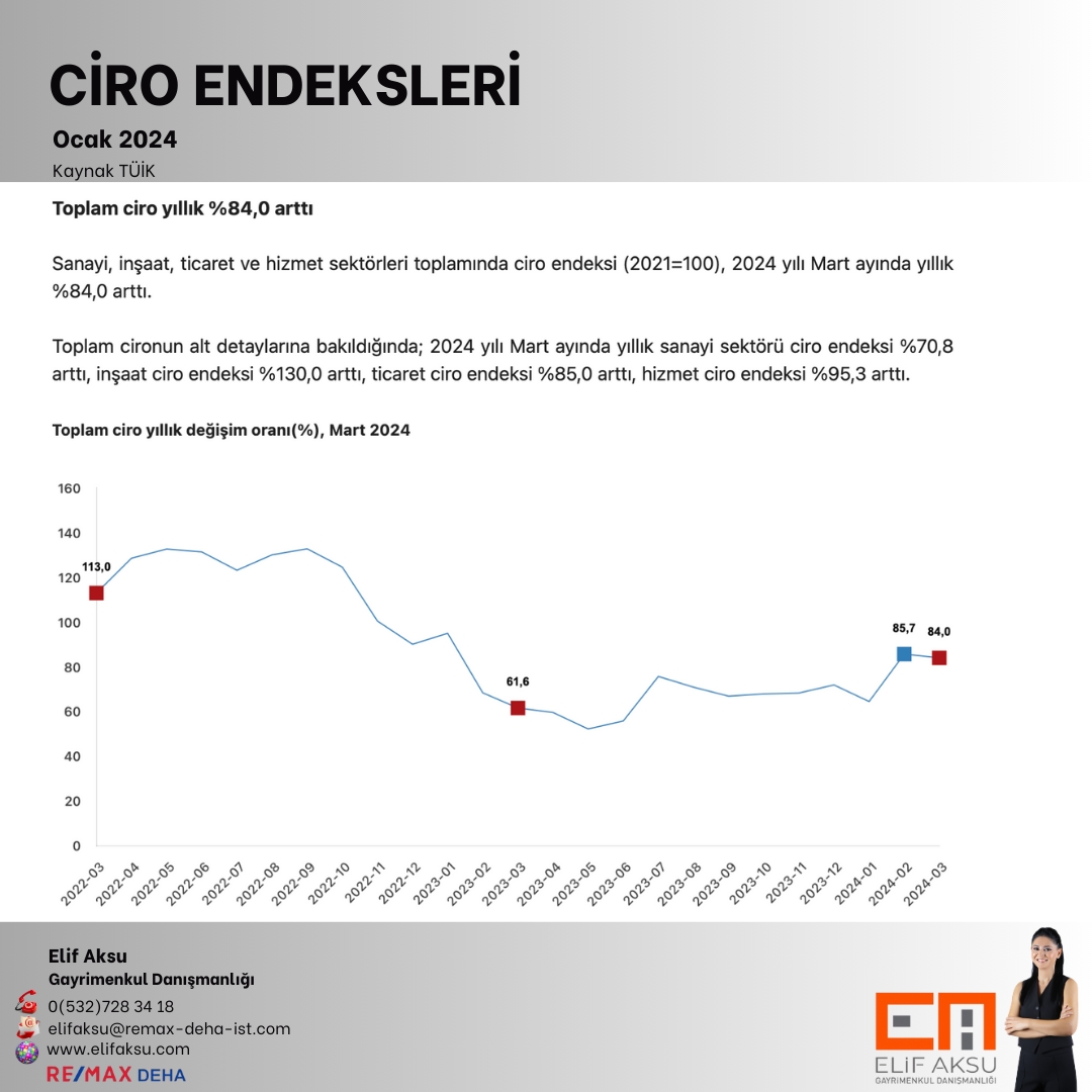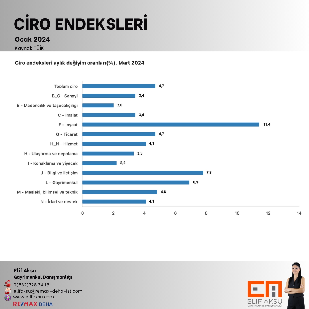 Sanayi, inşaat, ticaret ve hizmet sektörleri toplamında ciro endeksi (2021=100), 2024 yılı Mart ayında yıllık sanayi sektörü ciro endeksi %70,8 arttı, inşaat ciro endeksi %130,0 arttı, ticaret ciro endeksi %85,0 arttı, hizmet ciro endeksi %95,3 arttı.