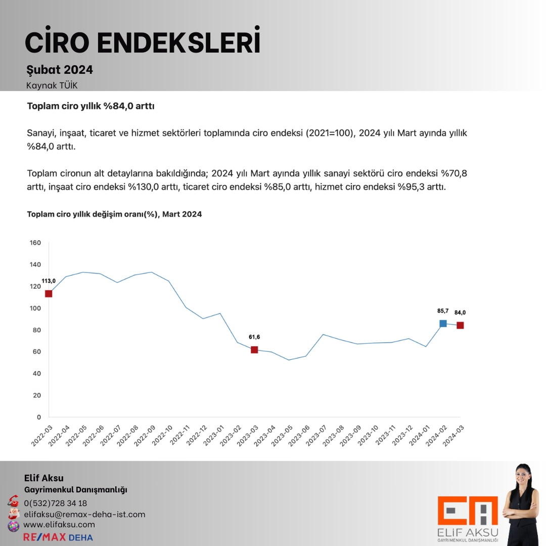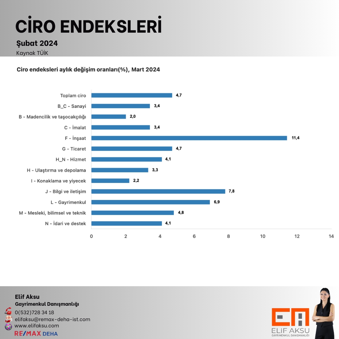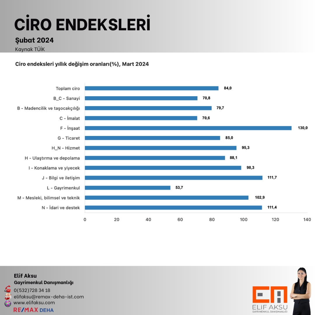 Sanayi, inşaat, ticaret ve hizmet sektörleri toplamında ciro endeksi (2021=100), 2024 yılı Mart ayında yıllık sanayi sektörü ciro endeksi %70,8 arttı, inşaat ciro endeksi %130,0 arttı, ticaret ciro endeksi %85,0 arttı, hizmet ciro endeksi %95,3 arttı.