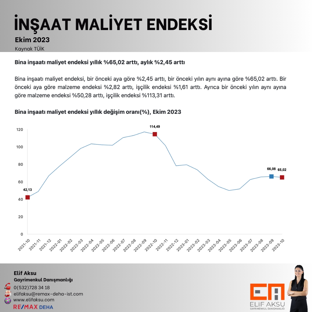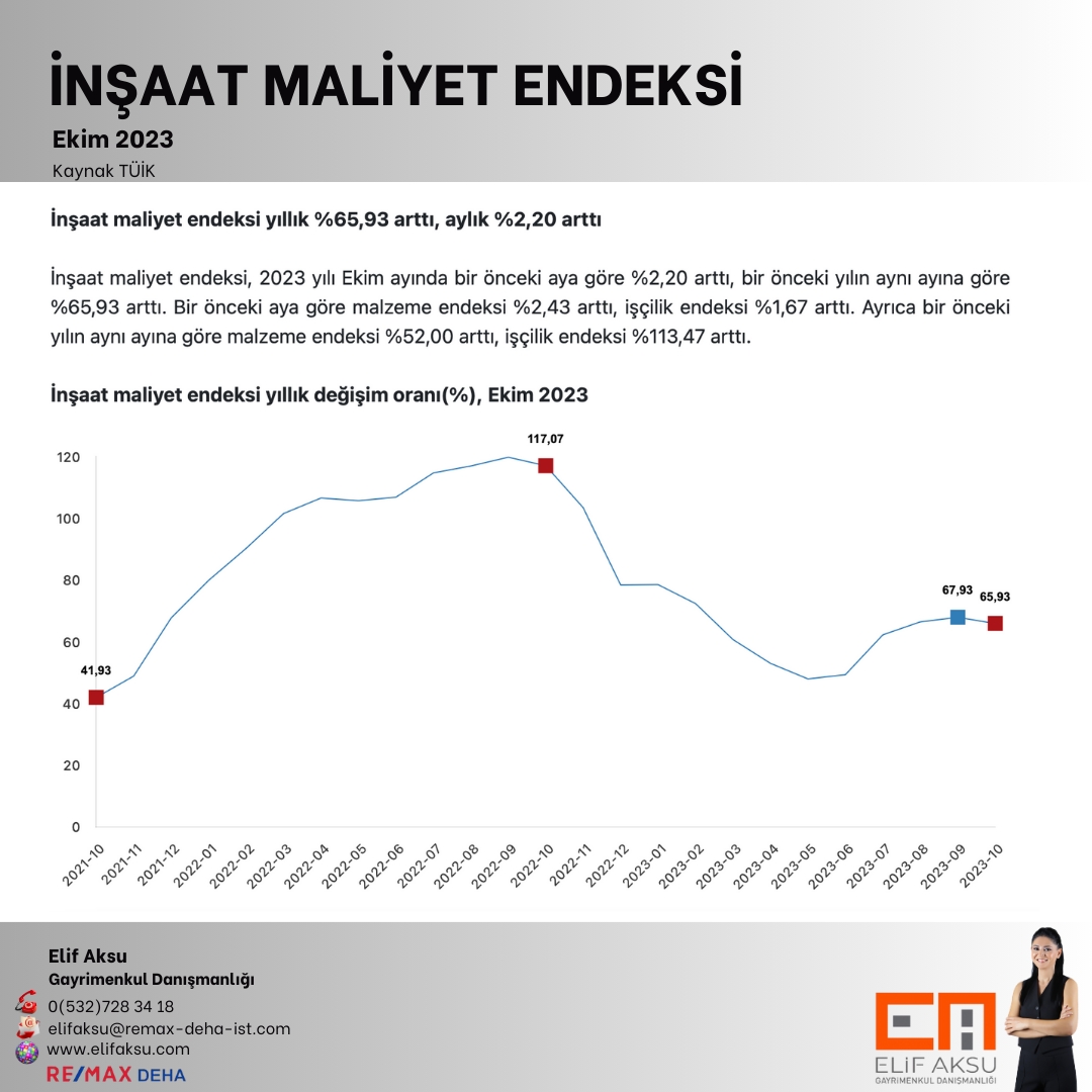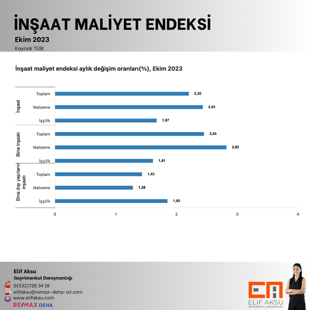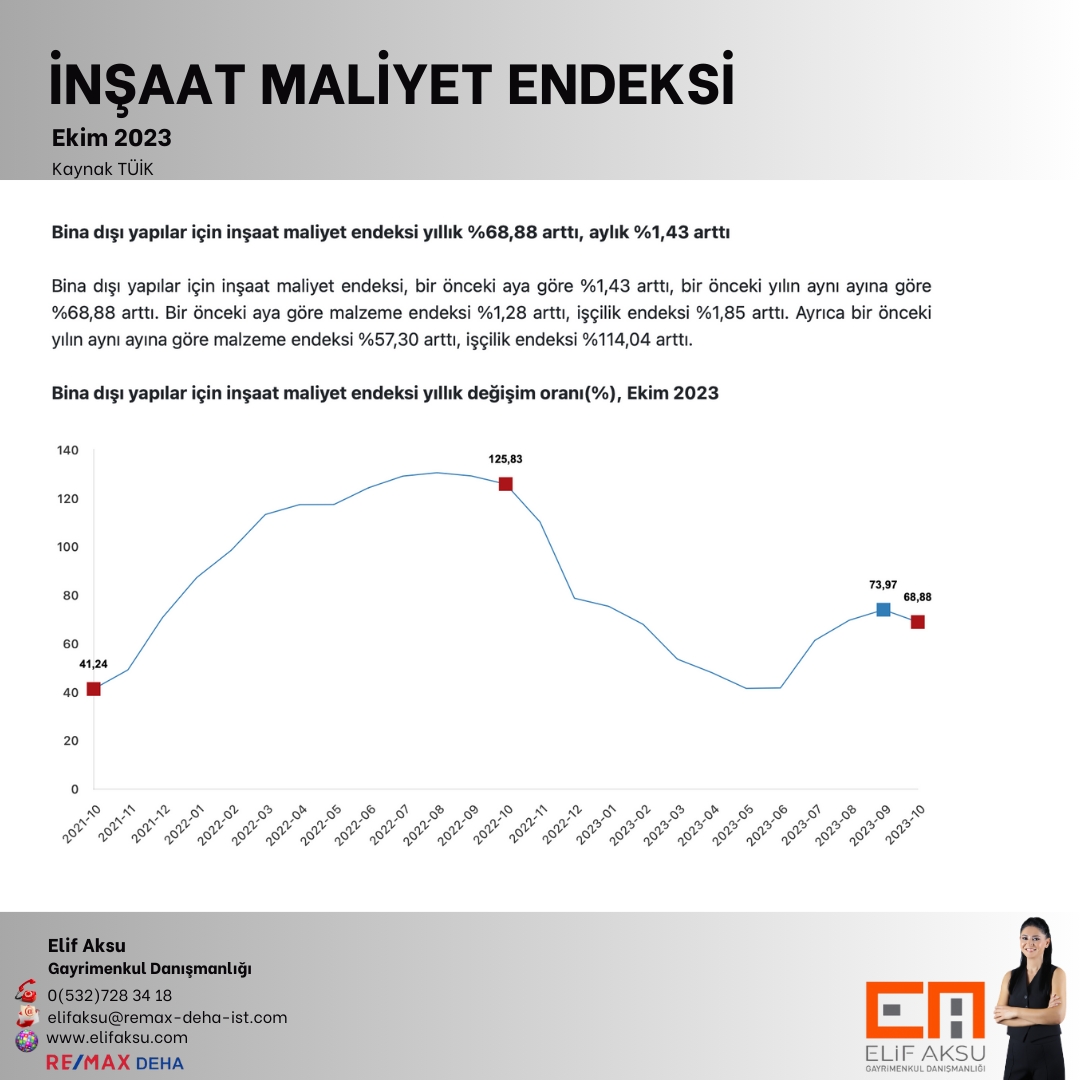 İnşaat maliyet endeksi, 2023 yılı Ekim ayında bir önceki aya göre %2.20 arttı, bir önceki yılın aynı ayına göre %65.93 arttı. Bir önceki aya göre malzeme endeksi %2.43 arttı, işçilik endeksi %1.67 arttı.
