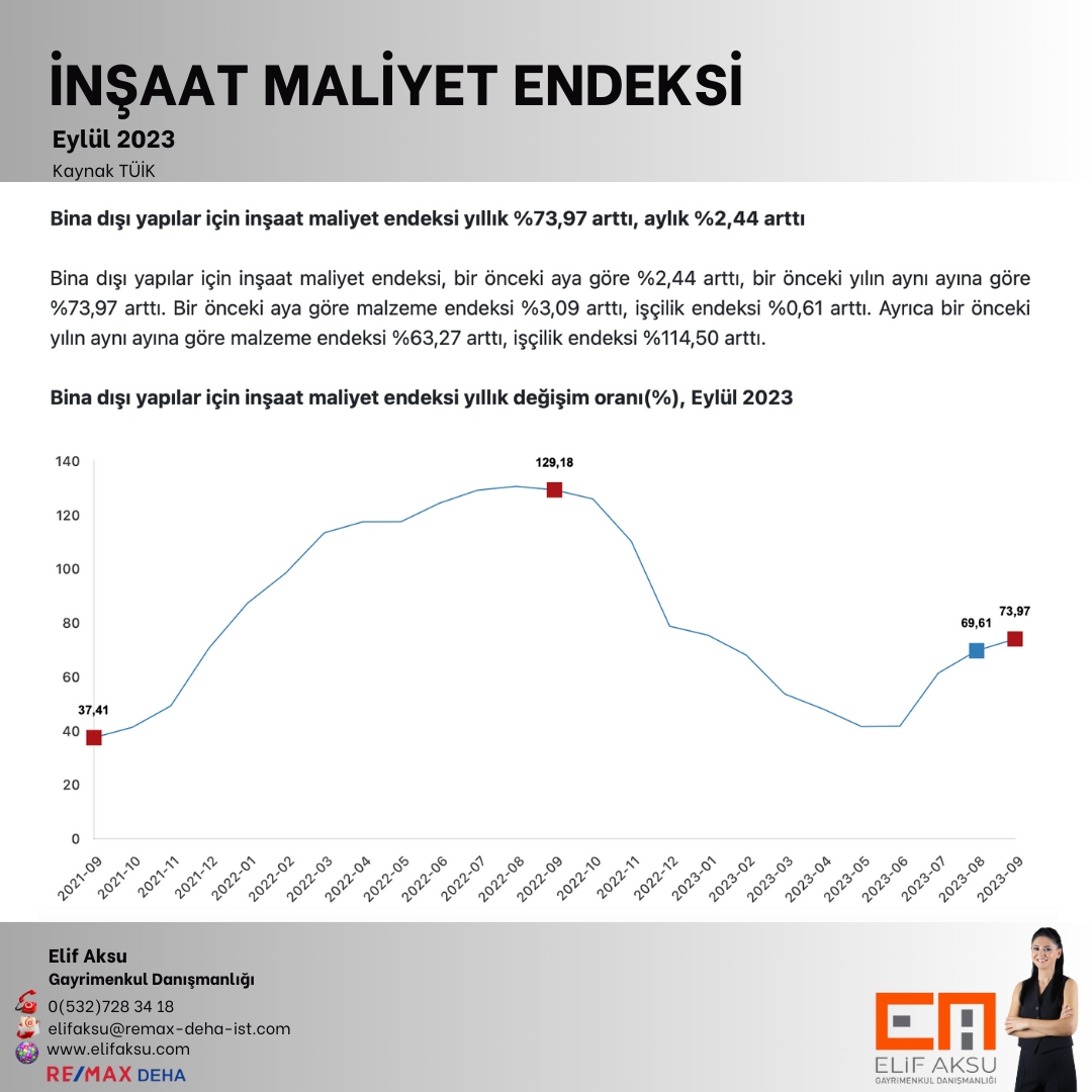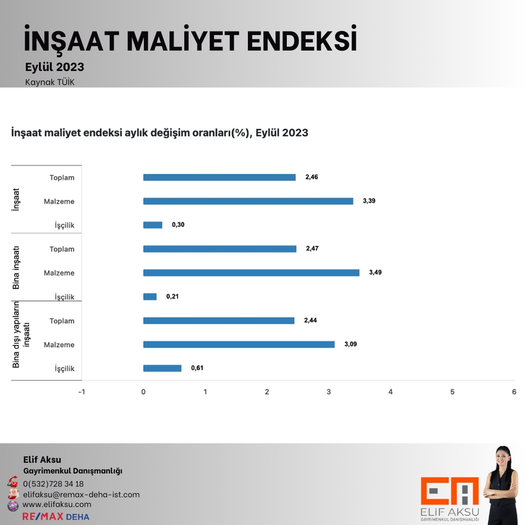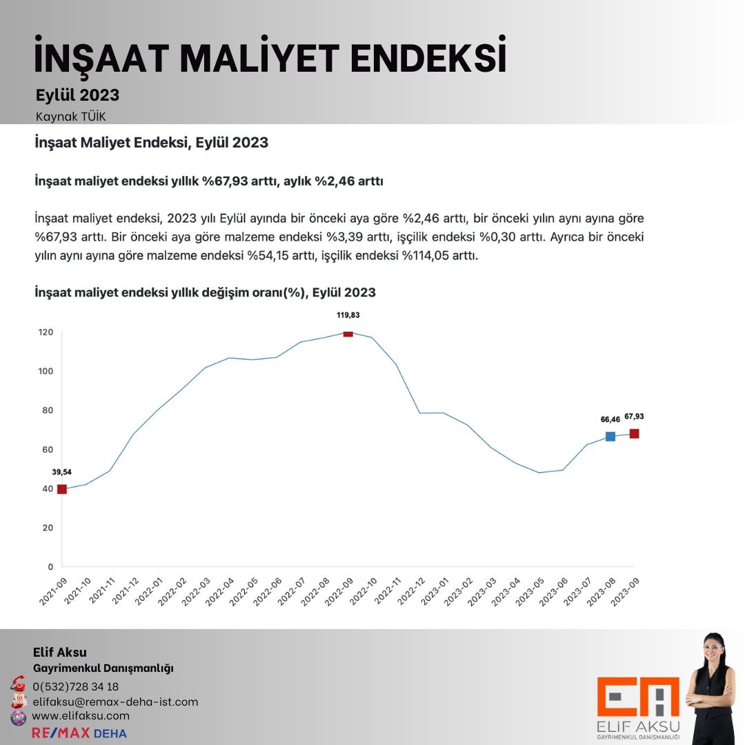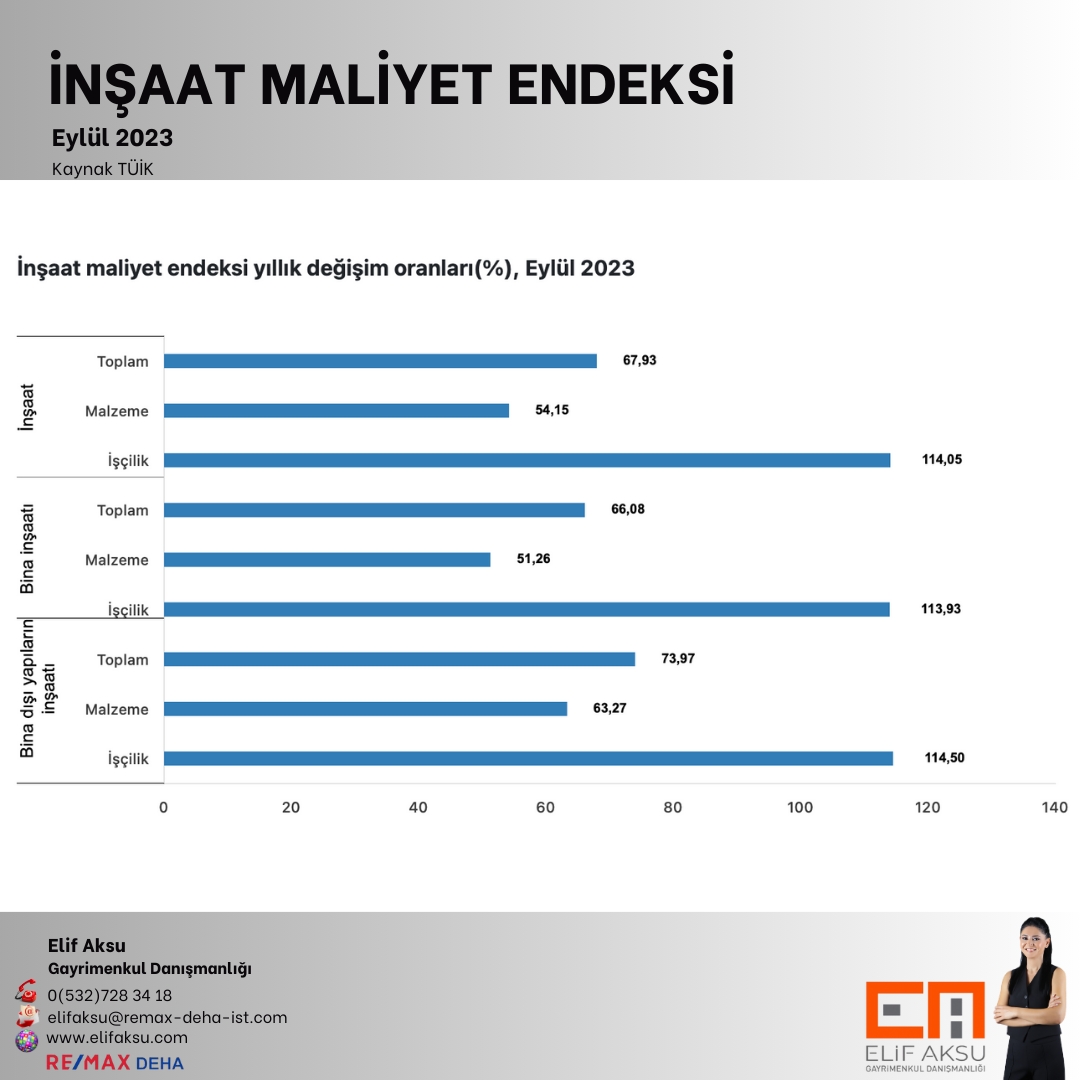 İnşaat maliyet endeksi, 2023 yılı Eylül ayında bir önceki aya göre %2.46 arttı, bir önceki yılın aynı ayına göre %67.93 arttı. Bir önceki aya göre malzeme endeksi %3.39 arttı, işçilik endeksi %0.30 arttı. Ayrıca bir önceki yılın aynı ayına göre malzeme endeksi %54.15 arttı, işçilik endeksi %114.05 arttı.