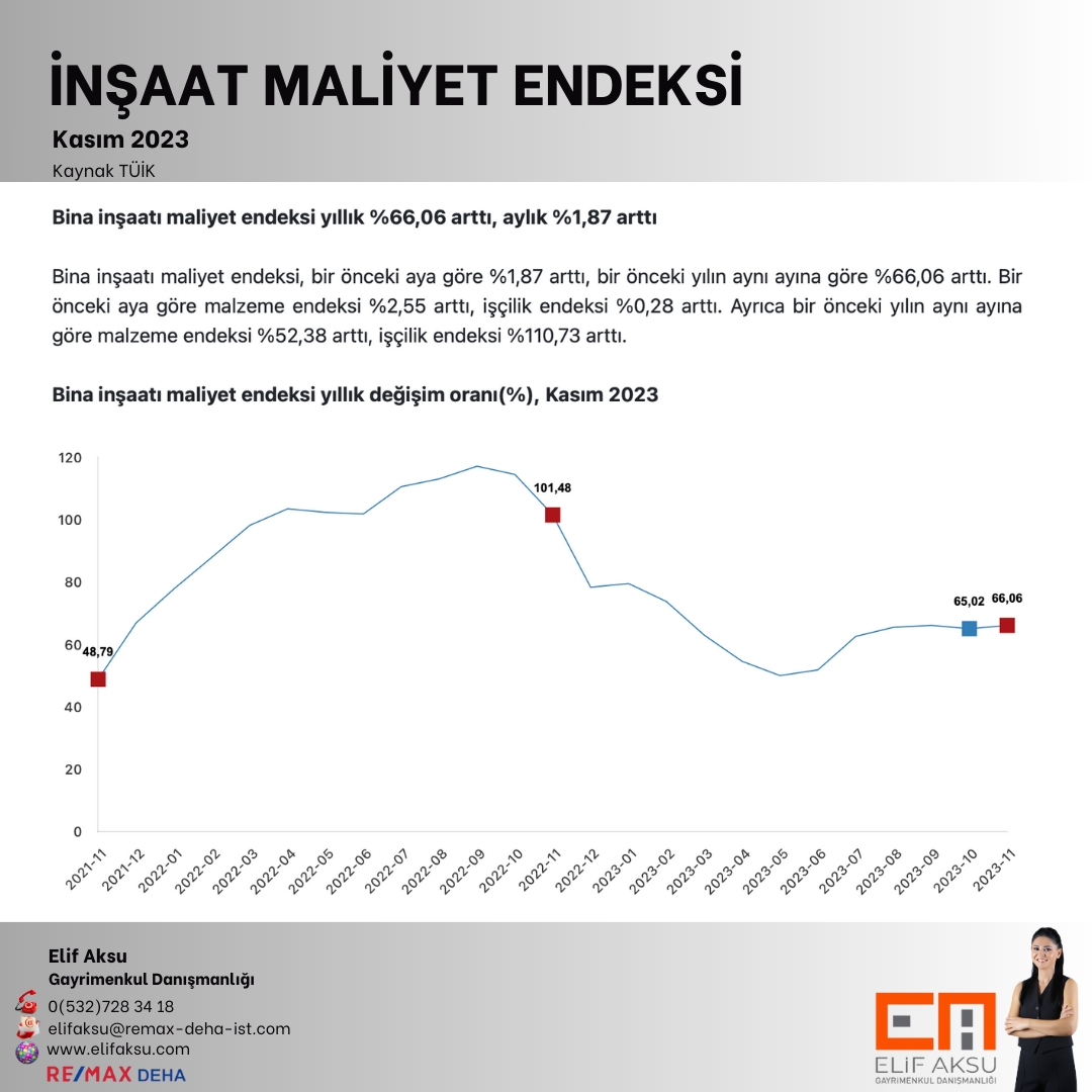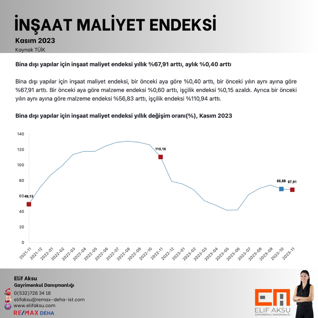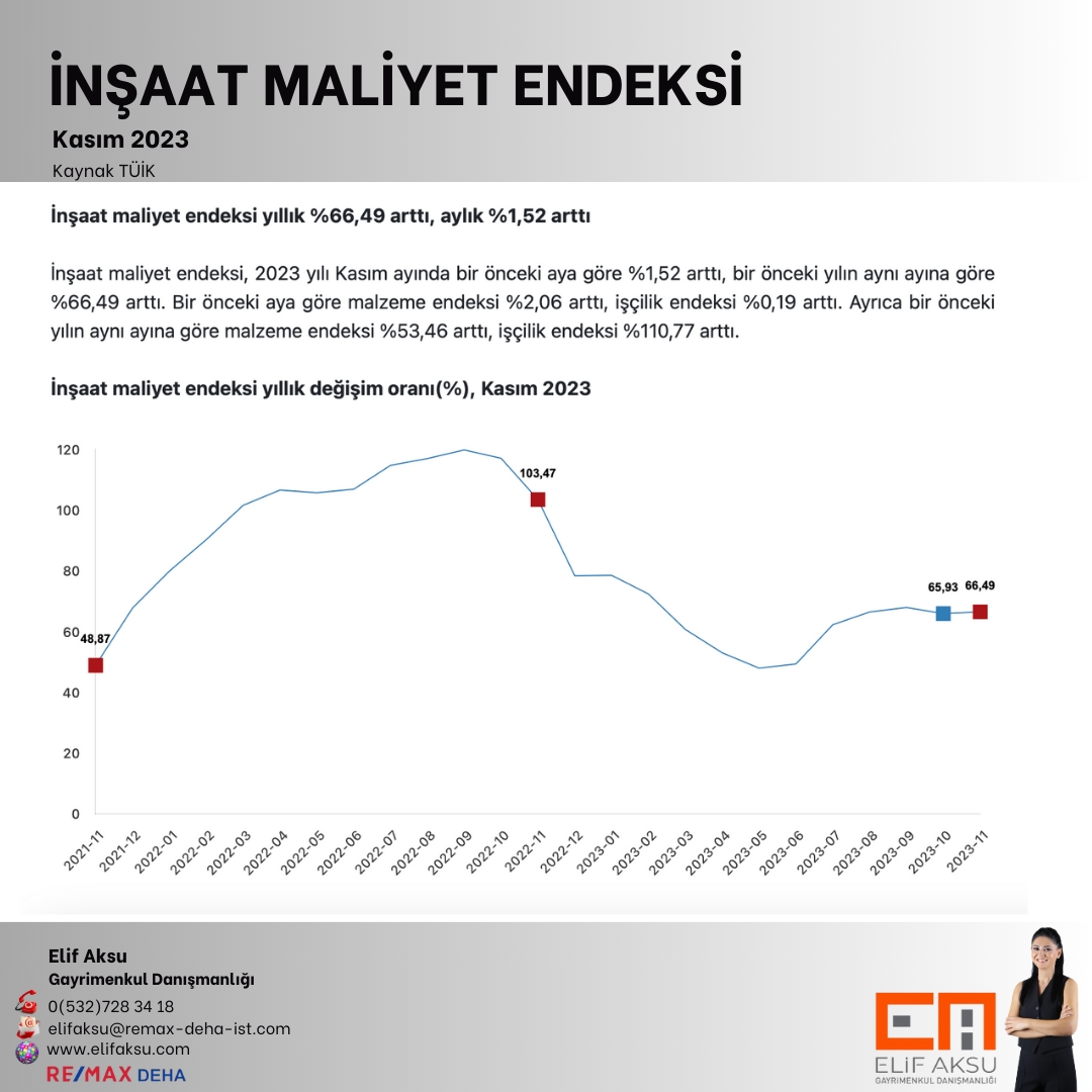 İnşaat maliyet endeksi, 2023 yılı Kasım ayında bir önceki aya göre %1.52 arttı, bir önceki yılın aynı ayına göre %66.49 arttı. Bir önceki aya göre malzeme endeksi %2.06 arttı, işçilik endeksi %0.19 arttı. Ayrıca bir önceki yılın aynı ayına göre malzeme endeksi %53.46 arttı, işçilik endeksi %110.77 arttı.