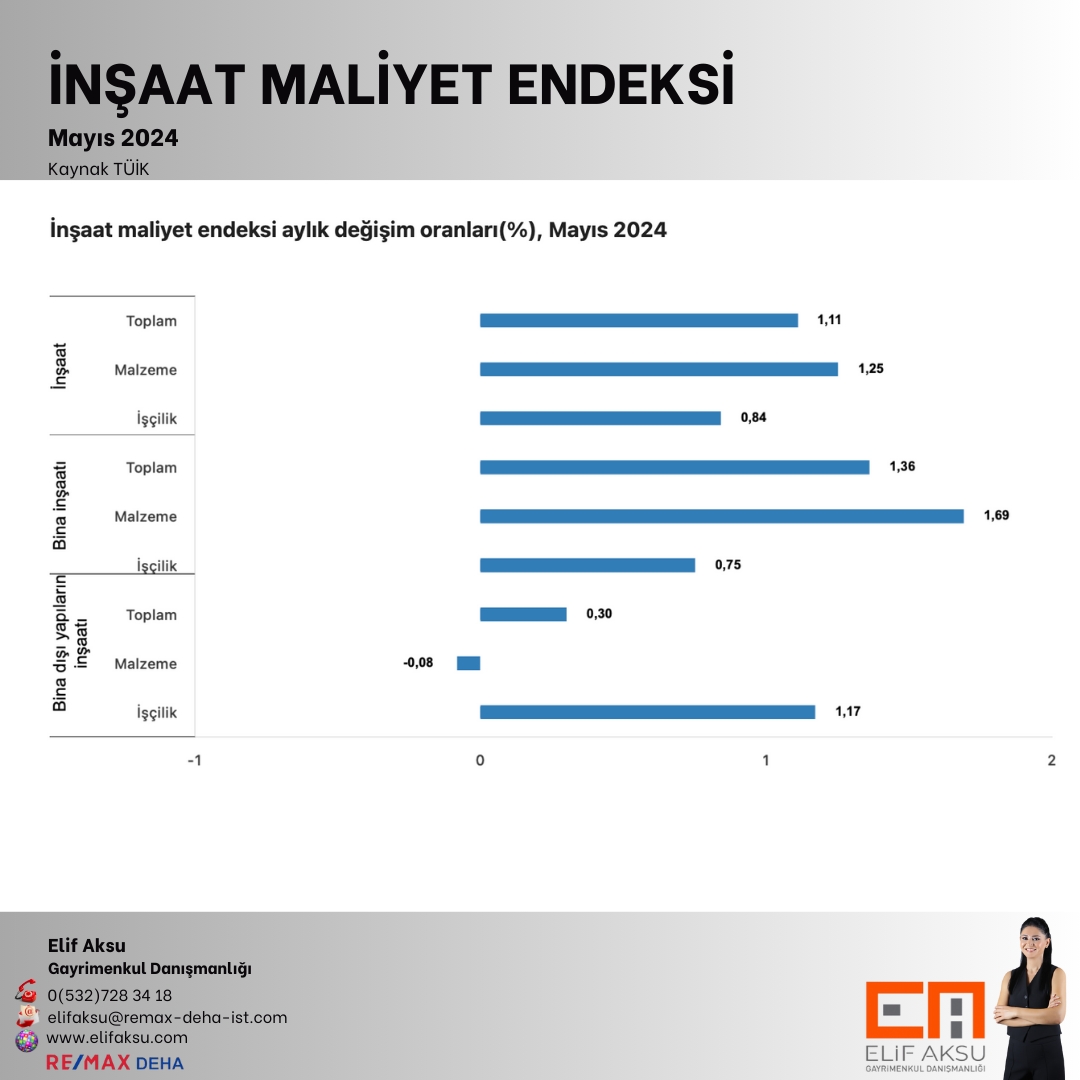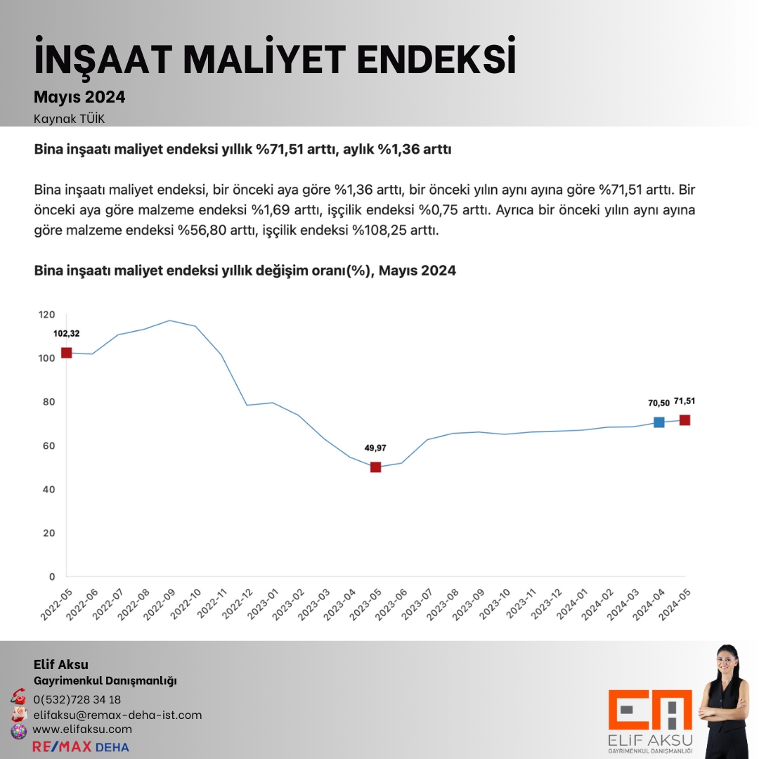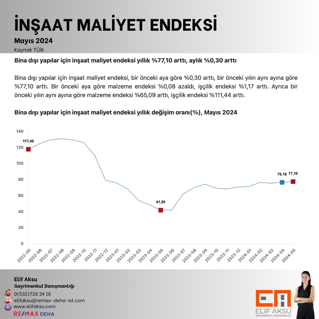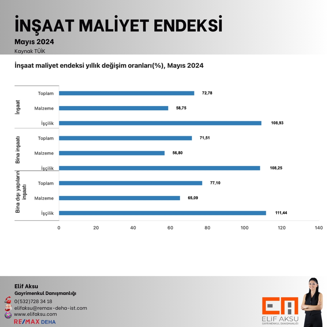İnşaat maliyet endeksi, 2024 yılı Mayıs ayında bir önceki aya göre %1,11 arttı, bir önceki yılın aynı ayına göre %72,78 arttı. Bir önceki aya göre malzeme endeksi %1,25 arttı, işçilik endeksi %0,84 arttı. Ayrıca bir önceki yılın aynı ayına göre malzeme endeksi %58,75 arttı, işçilik endeksi %108,93 arttı.
