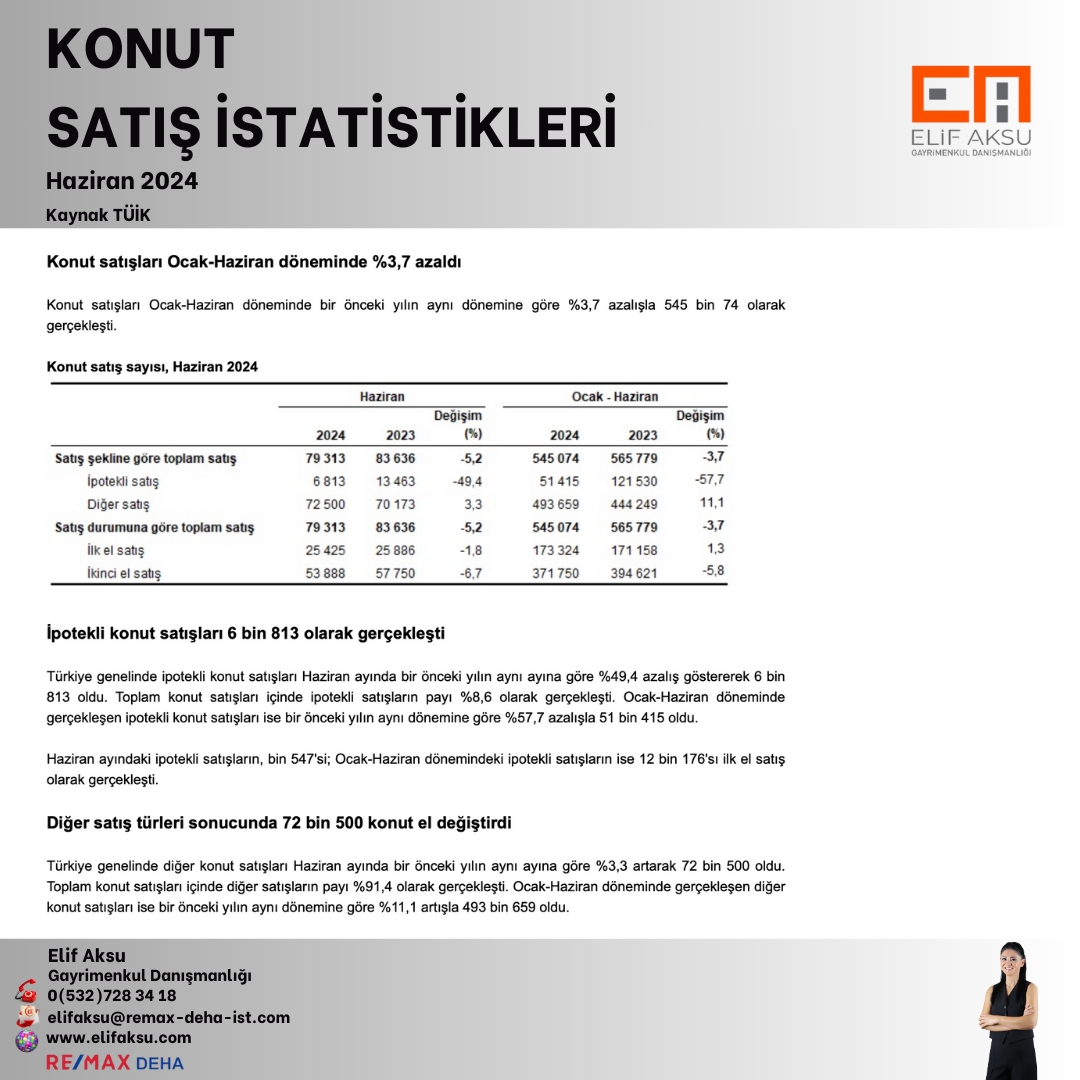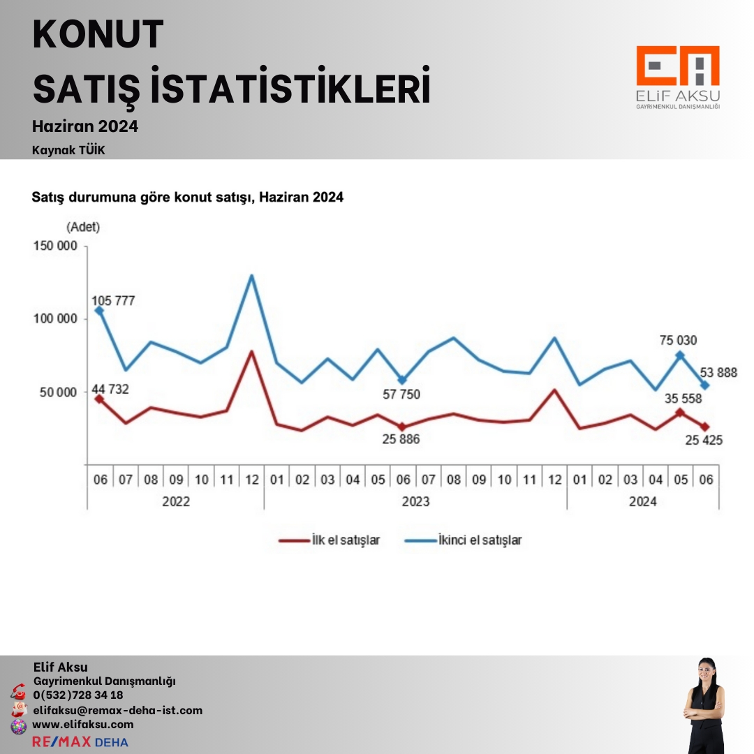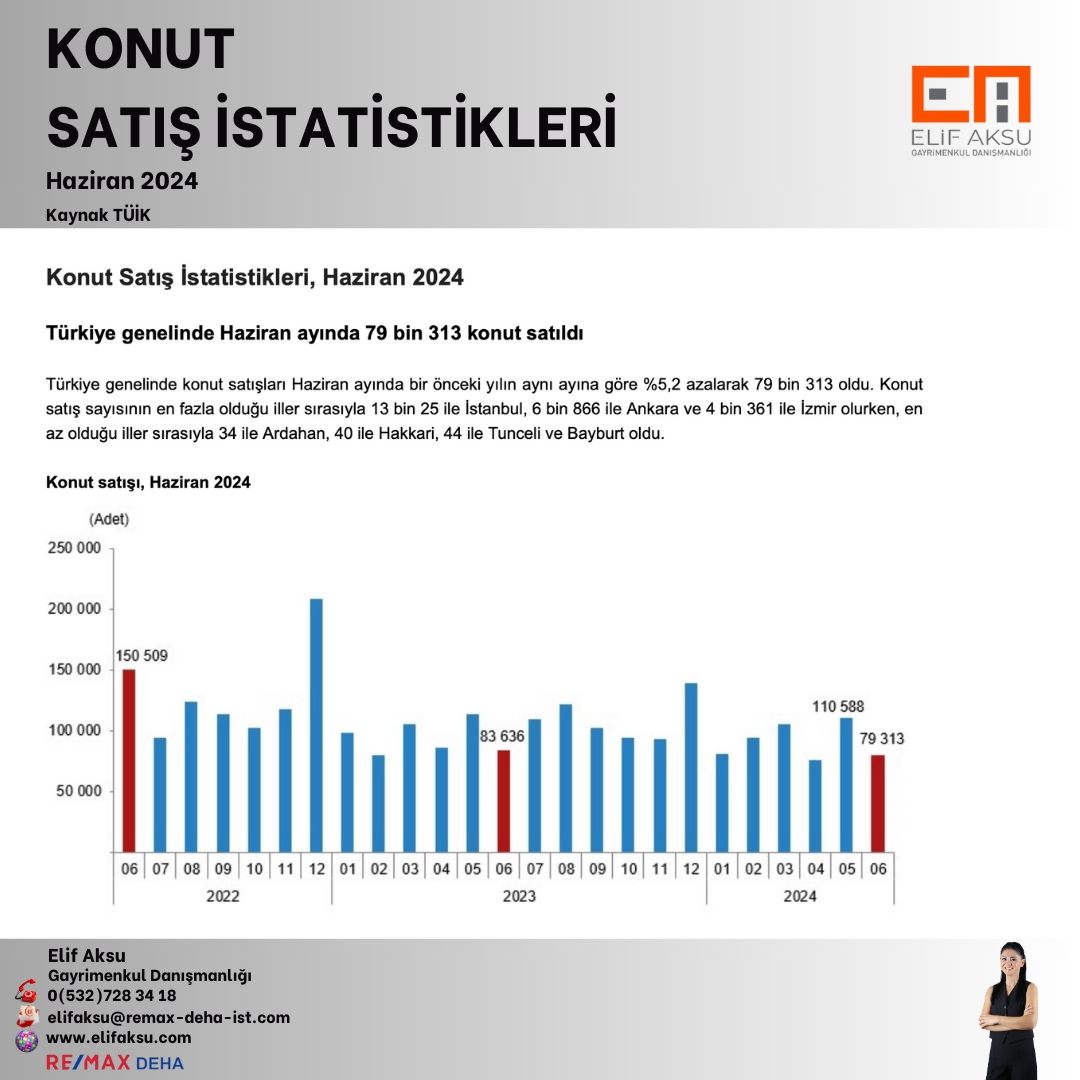 Türkiye genelinde konut satışları Haziran ayında bir önceki yılın aynı ayına göre %5,2 azalarak 79 bin 313 oldu. Konut satış sayısının en fazla olduğu iller sırasıyla 34 ile Ardahan, 40 ile Hakkari, 44 ile Tunceli ve Bayburt oldu.
