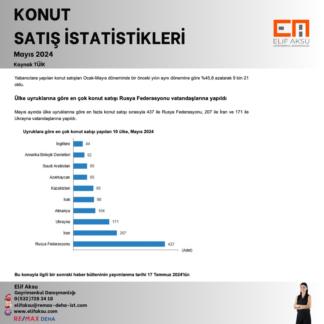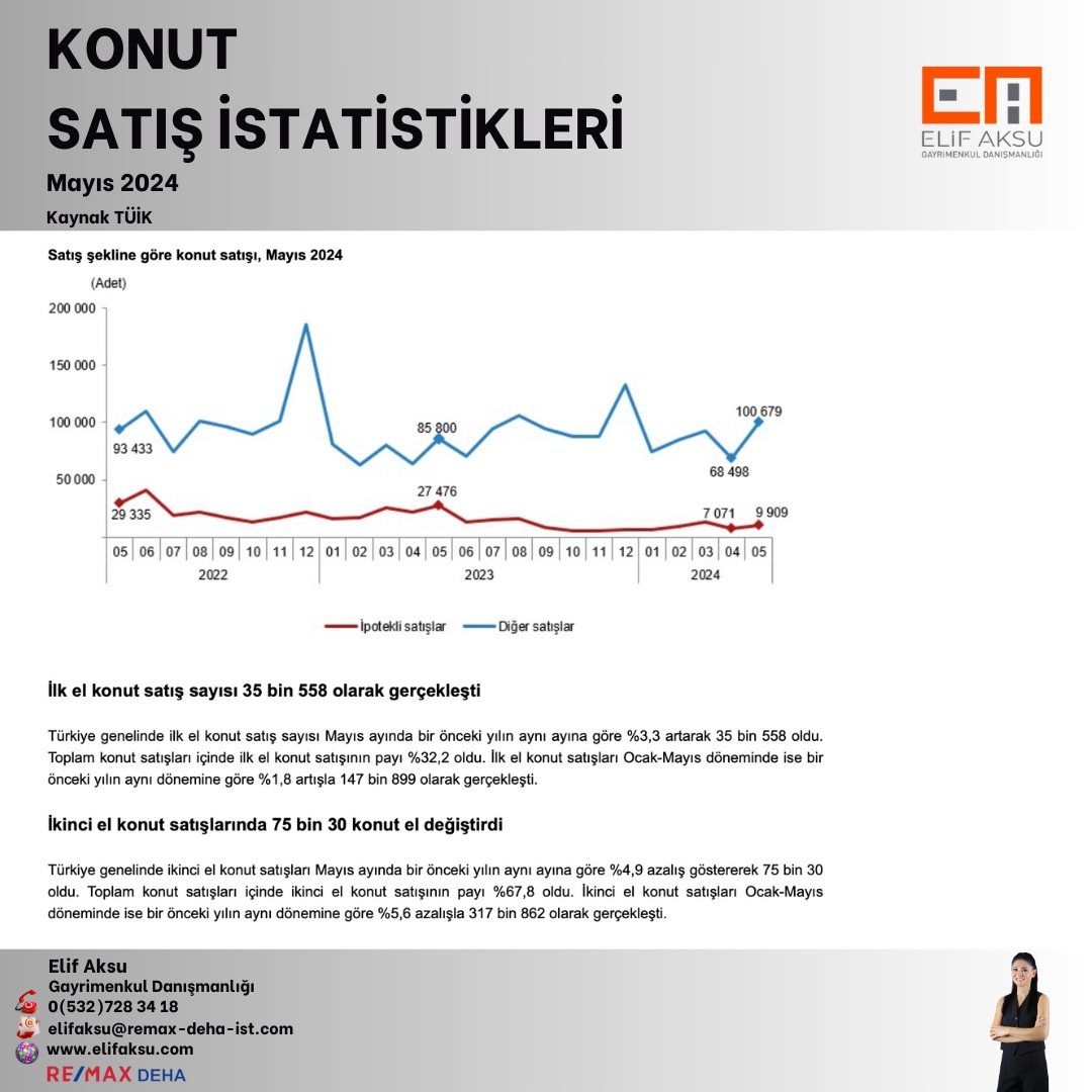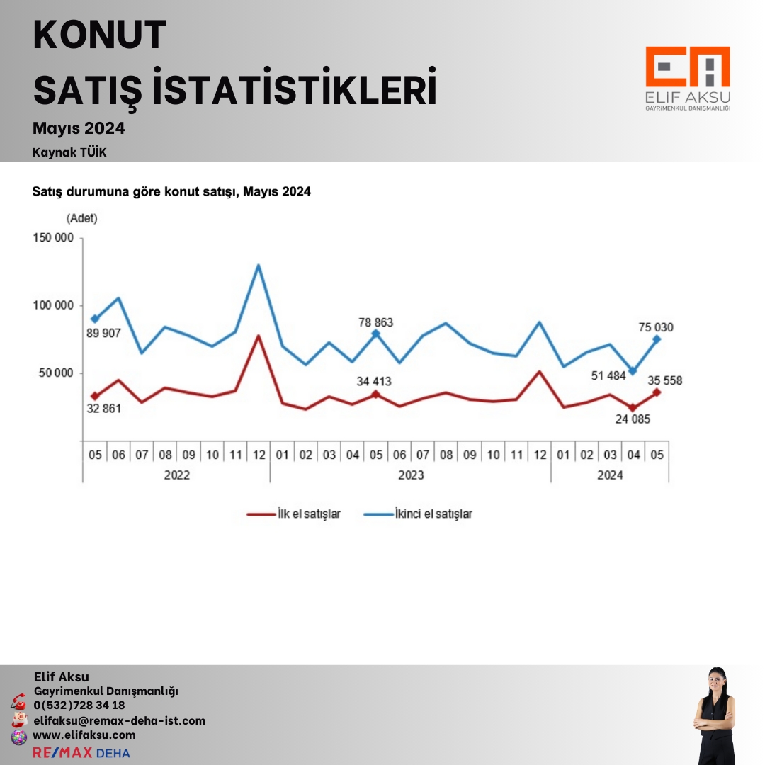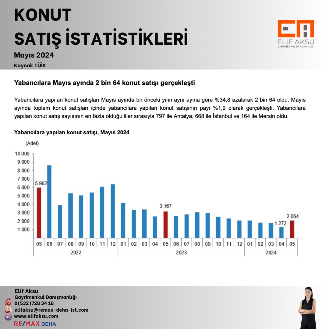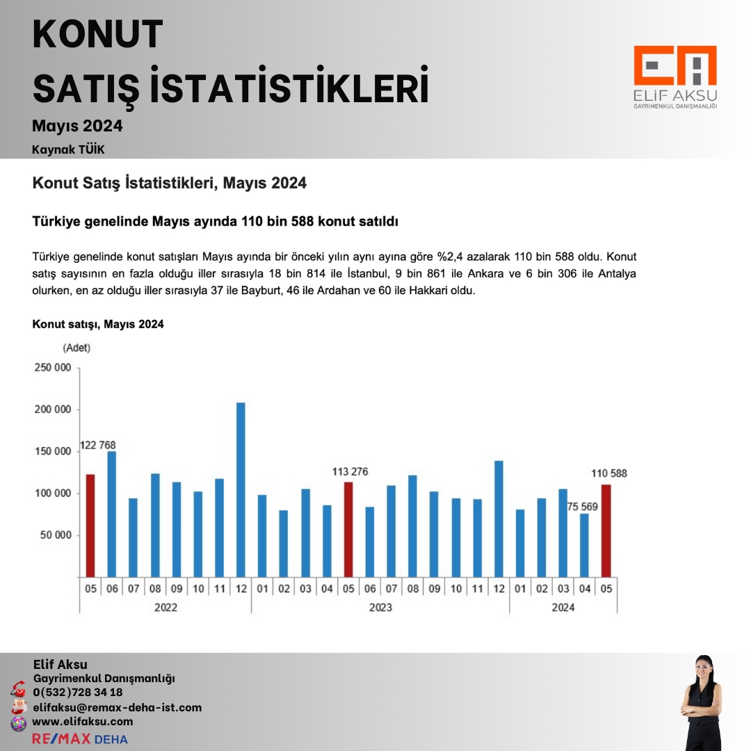 Türkiye genelinde konut satışları Mayıs ayında bir önceki yılın aynı ayına göre %2,4 azalarak 110 bin 588 oldu. Konut satış sayısının en fazla olduğu iller sırasıyla 18 bin 814 ile İstanbul, 9 bin 861 ile Ankara ve 6 bin 306 ile Antalya olurken, en az olduğu iller sırasıyla 37 ile Bayburt, 45 ile Ardahan ve 60 ile Hakkari oldu.