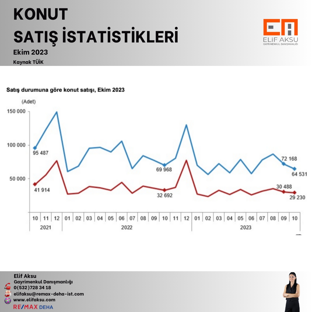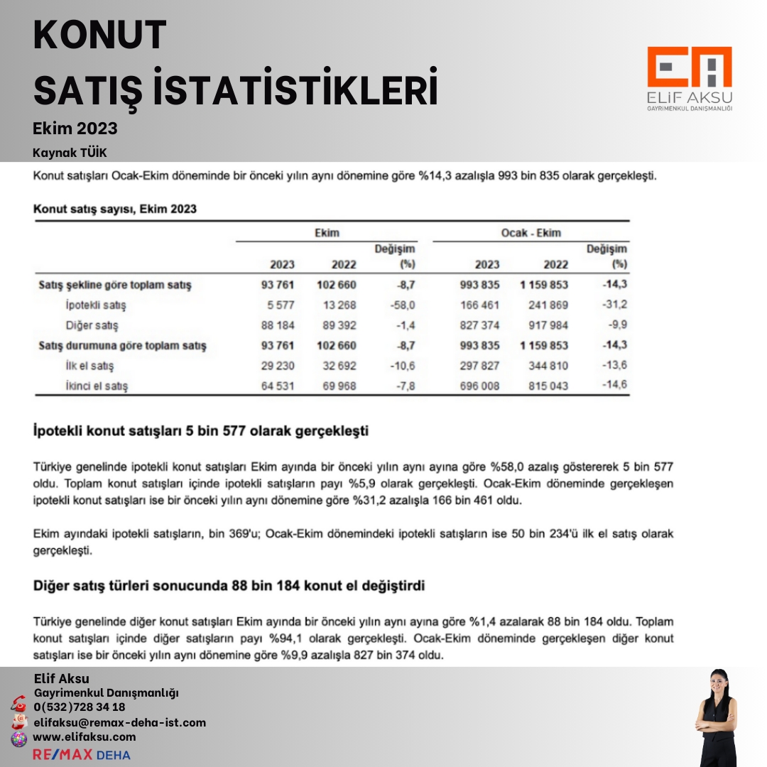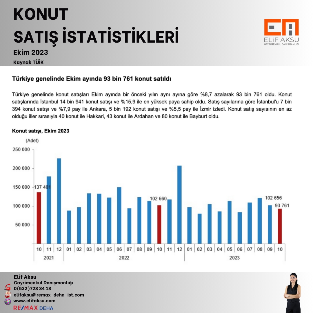 Türkiye genelinde konut satışları Ekim ayında bir önceki yılın aynı ayına göre %8.7 azalarak 93 bin 761 oldu. Konut satışlarında İstanbul 14 bin 941 konut satışı ve %15.9 ile en yüksek paya sahip oldu.