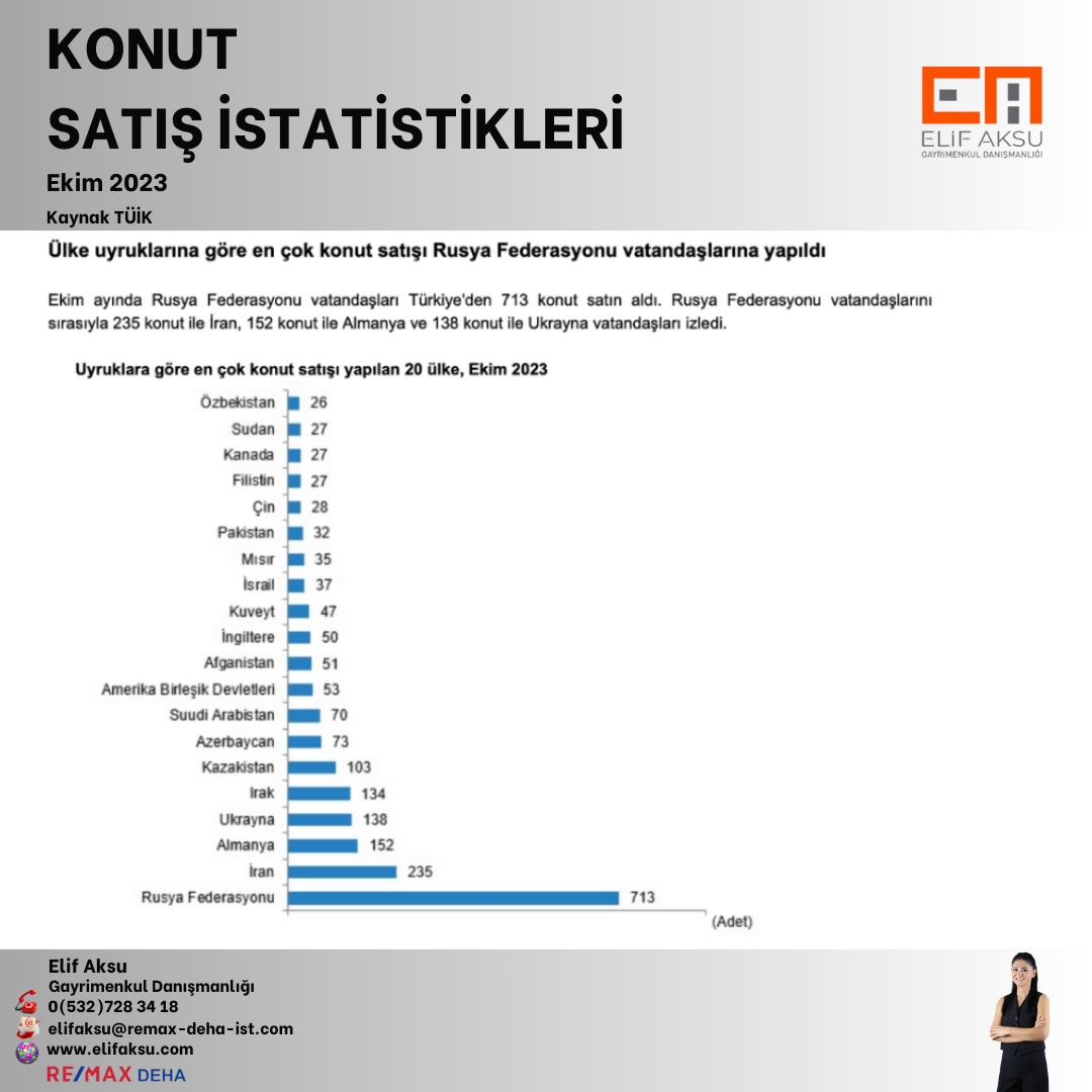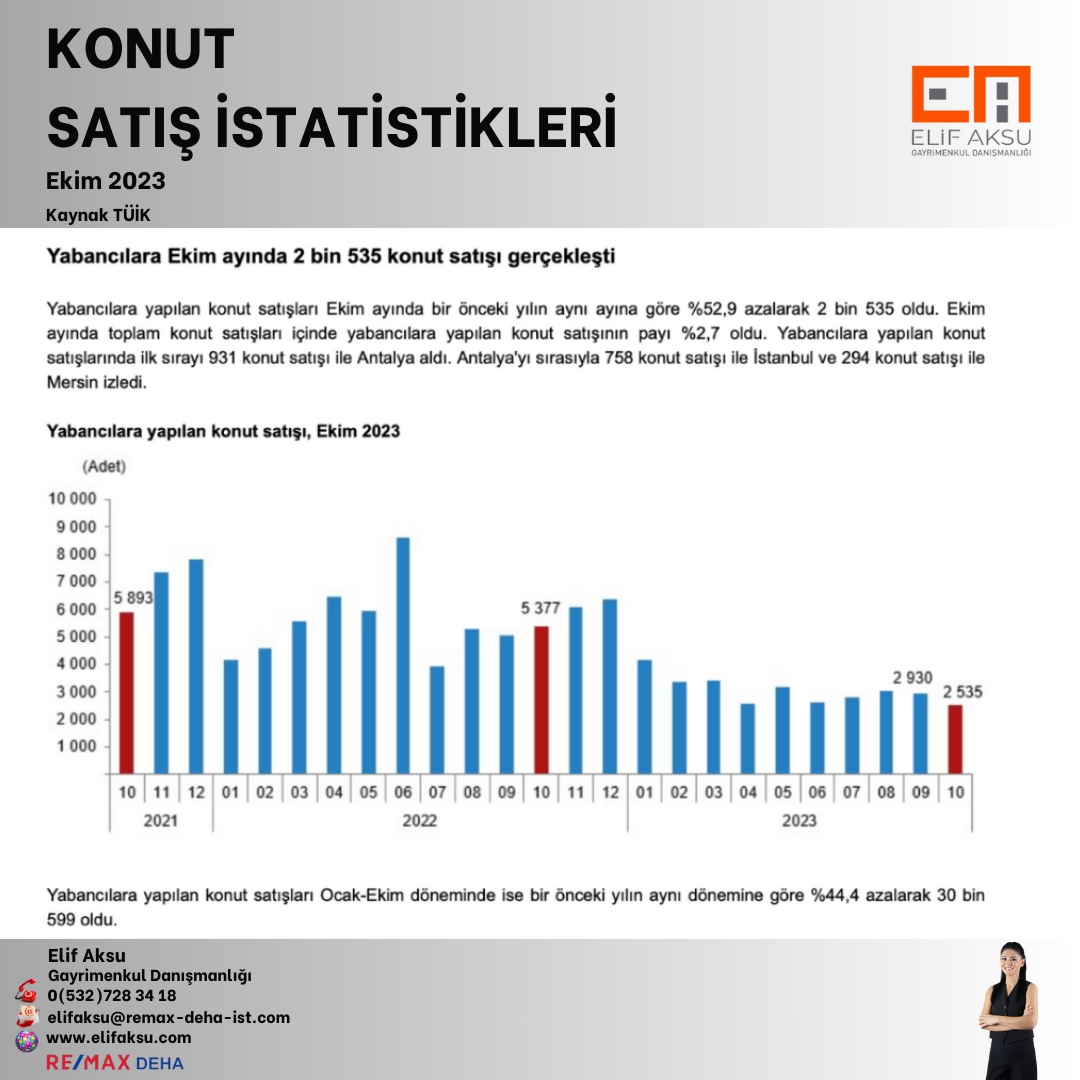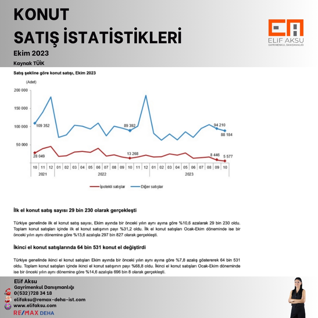 Türkiye genelinde konut satışları Ekim ayında bir önceki yılın aynı ayına göre %8.7 azalarak 93 bin 761 oldu. Konut satışlarında İstanbul 14 bin 941 konut satışı ve %15.9 ile en yüksek paya sahip oldu.
