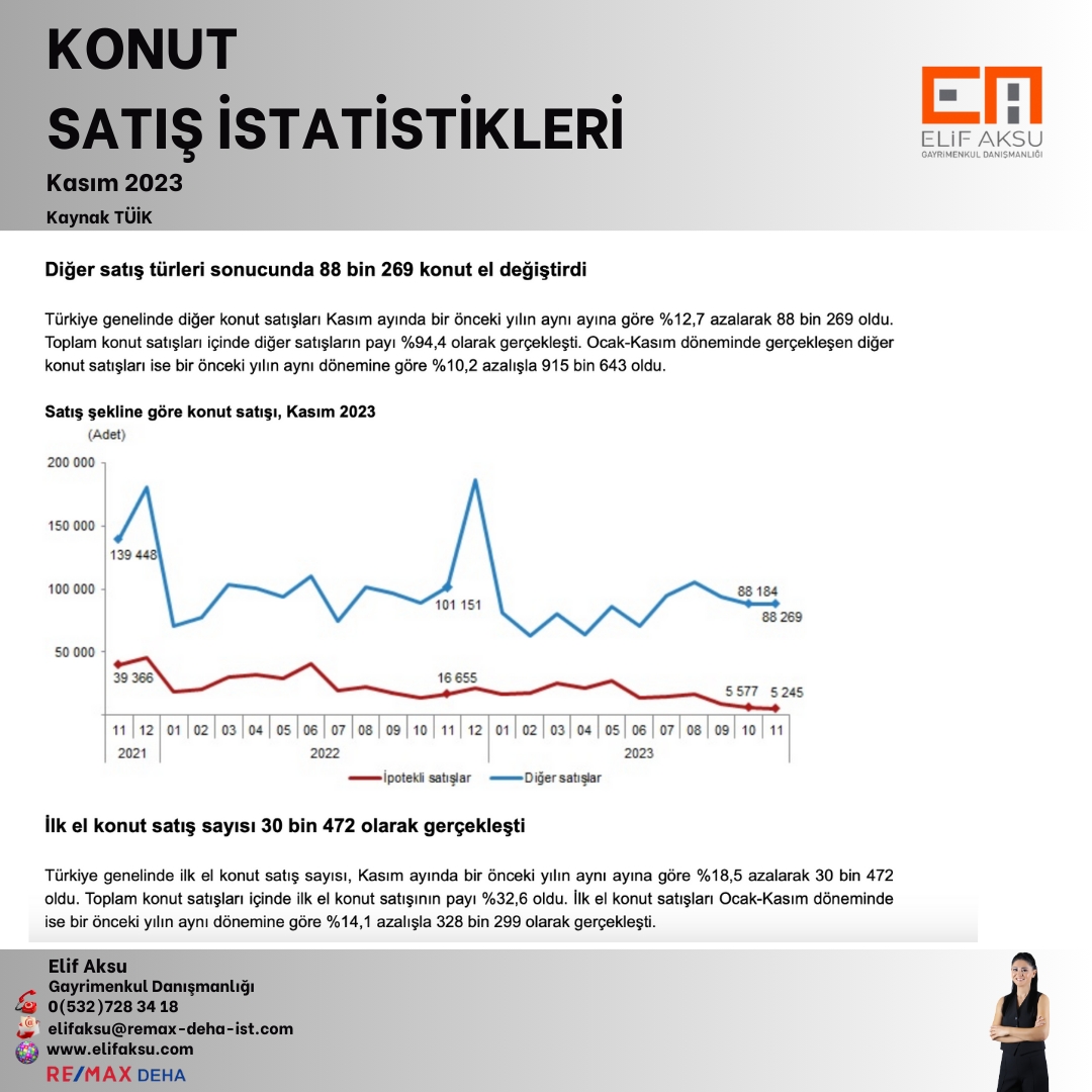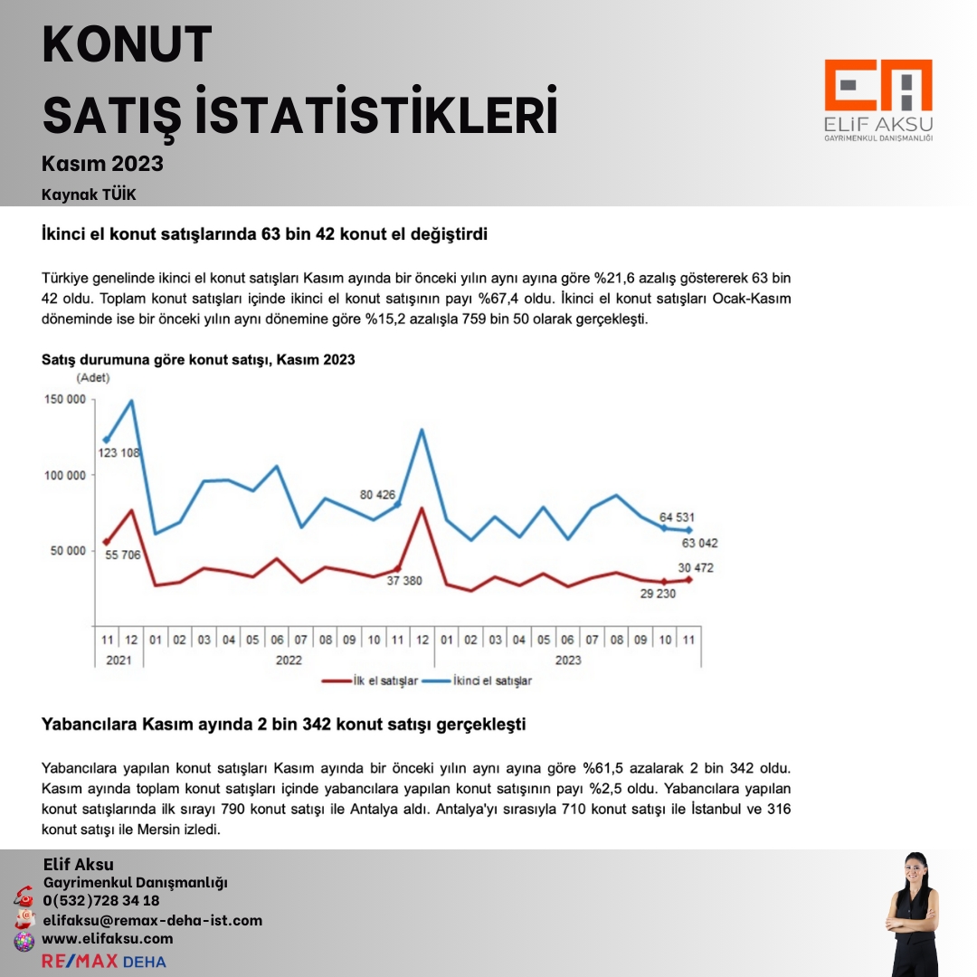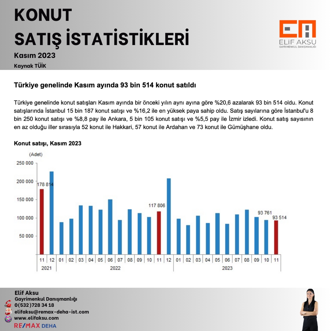 Türkiye genelinde konut satışları Kasım ayında bir önceki yılın aynı ayına göre %20.6 azalarak 93 bin 514 oldu. Konut satışlarında İstanbul 15 bin 187 konut satışı ve %16.2 ile en yüksek paya sahip oldu. Satış sayılarına göre İstanbul’u 8 bin 250 konut satışı ve %8.8 pay ile Ankara, 5 bin 105 konut satışı ve %5.5 pay ile İzmir izledi. Konut satış sayısının en az olduğu iller sırayla 52 konut ile Hakkari, 57 konut ile Ardahan ve 73 konut ile Gümüşhane oldu.