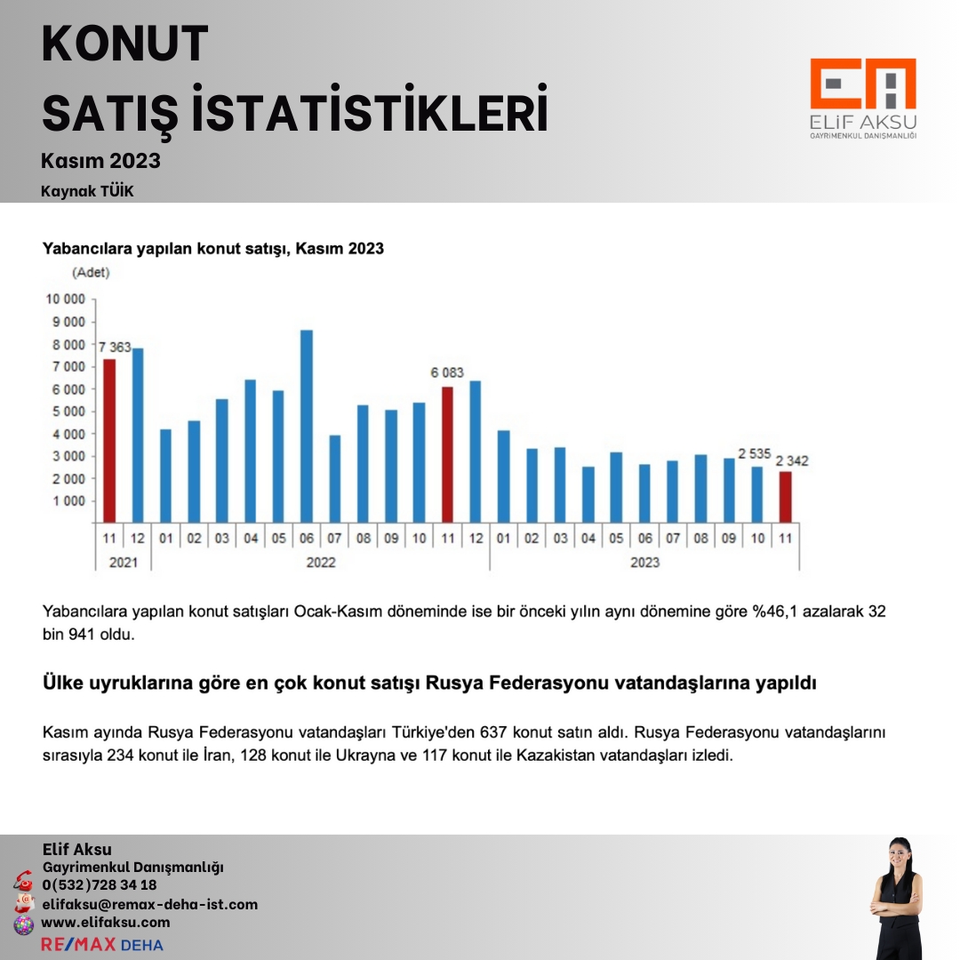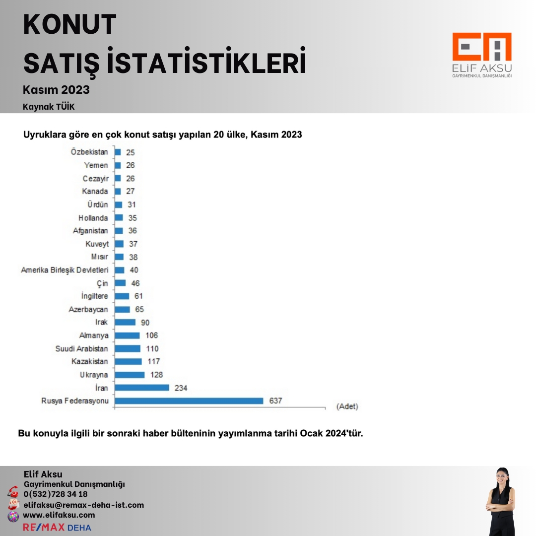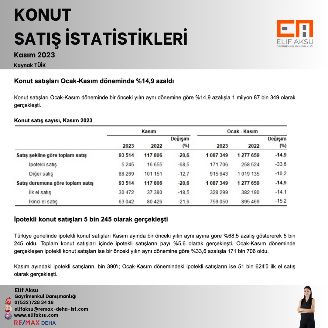 Türkiye genelinde konut satışları Kasım ayında bir önceki yılın aynı ayına göre %20.6 azalarak 93 bin 514 oldu. Konut satışlarında İstanbul 15 bin 187 konut satışı ve %16.2 ile en yüksek paya sahip oldu. Satış sayılarına göre İstanbul’u 8 bin 250 konut satışı ve %8.8 pay ile Ankara, 5 bin 105 konut satışı ve %5.5 pay ile İzmir izledi. Konut satış sayısının en az olduğu iller sırayla 52 konut ile Hakkari, 57 konut ile Ardahan ve 73 konut ile Gümüşhane oldu.