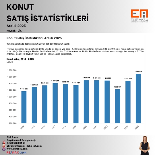 Türkiye genelinde konut satışları 2025 yılında bir önceki yıla göre %14,3 oranında artarak 1 milyon 688 bin 910 oldu. Konut satış sayısının en fazla olduğu iller sırasıyla 280 bin 262 ile İstanbul, 152 bin 534 ile Ankara ve 96 bin 998 ile İzmir olurken, en az olduğu iller sırasıyla 727 ile Ardahan, bin 251 ile Bayburt ve bin 559 ile Hakkari olarak gerçekleşti.